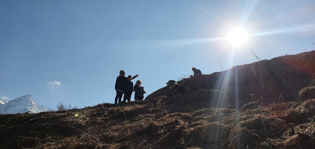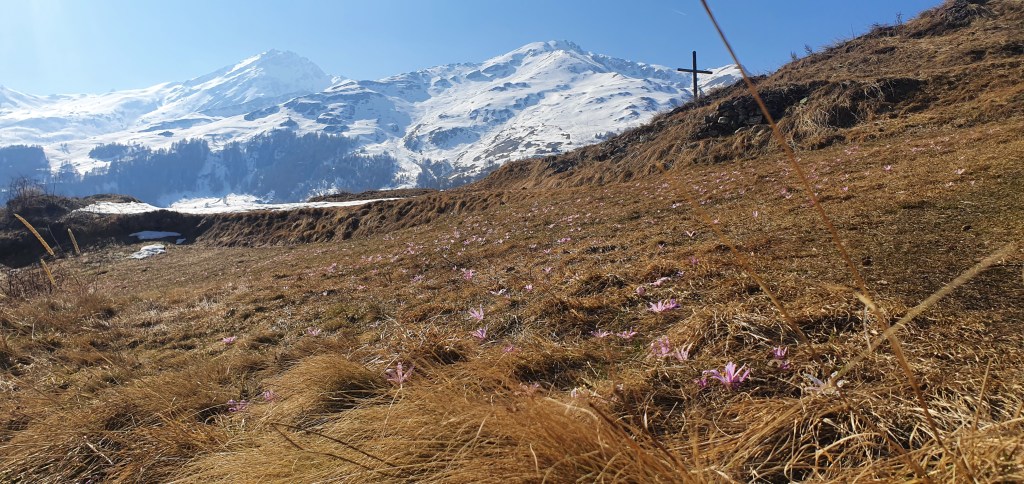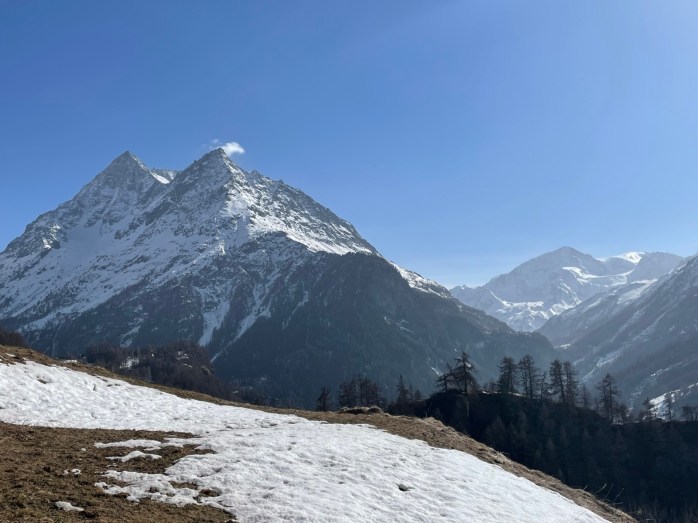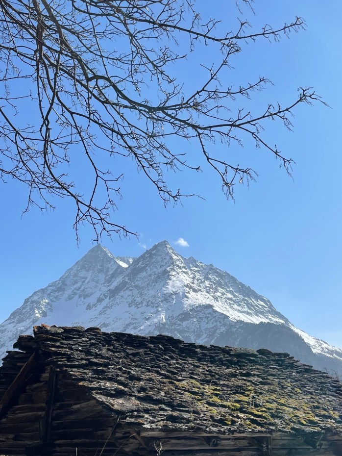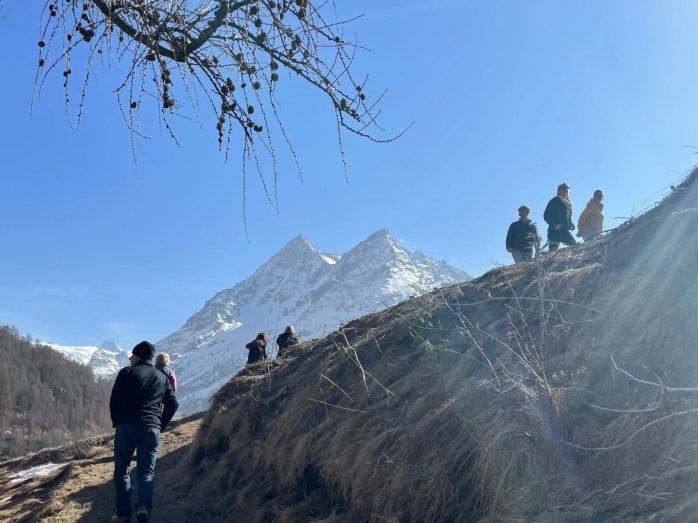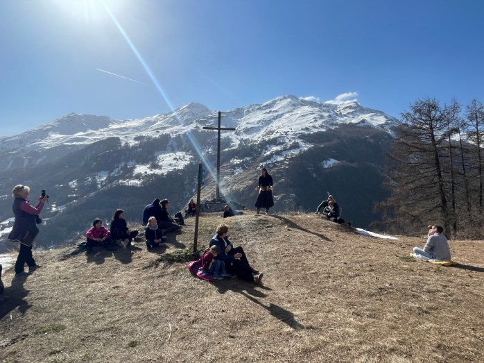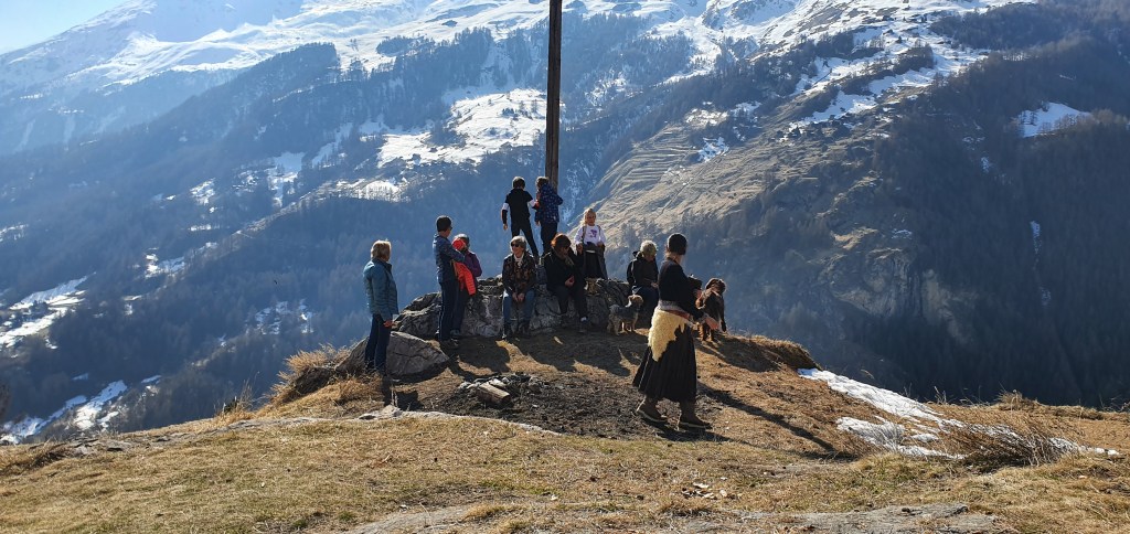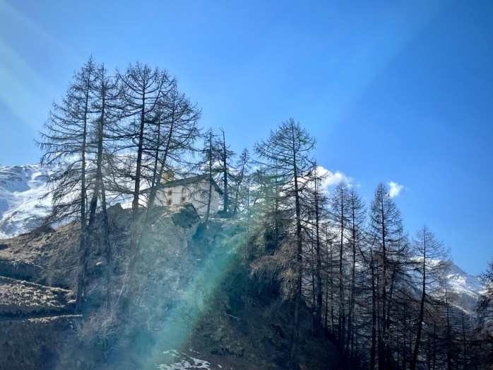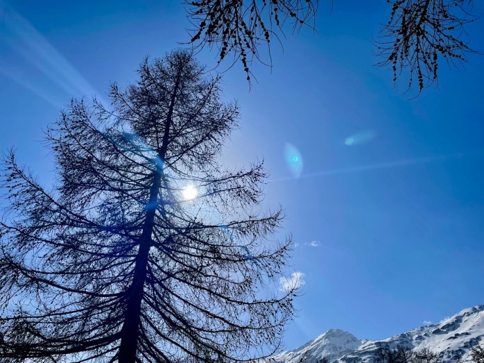 Après avoir appris comment le soleil s’était décidé à repointer le bout de son nez auprès des humains, à la fin d’un mois de décembre, nous avons grimpé jusqu’à la Chapelle Saint-Christophe, où, face au décor somptueux du Pigne d’Arolla, des Dents de Veisivi et de la Dent Blanche, nous avons pu découvrir la lutte sans merci des grandes majestés que sont le Soleil, le Vent et le Gel.