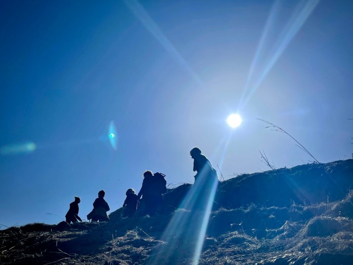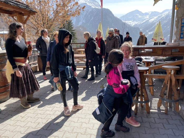 Nous nous sommes ensuite aventurés par le chemin des Marenich jusqu’aux restaurant Les Collines, chez Maud & François-Xavier, où Vanessa nous a conté l’histoire de Chinguebis face au Vent du Nord. Le jus de pommes chaud aux épices concocté par Maud nous a donné l’énergie qu’il nous fallait pour arriver au conte du printemps, juste devant l’épicerie, où nous avons pu résoudre le mystère du vol l’escarboucle de la vouivre.