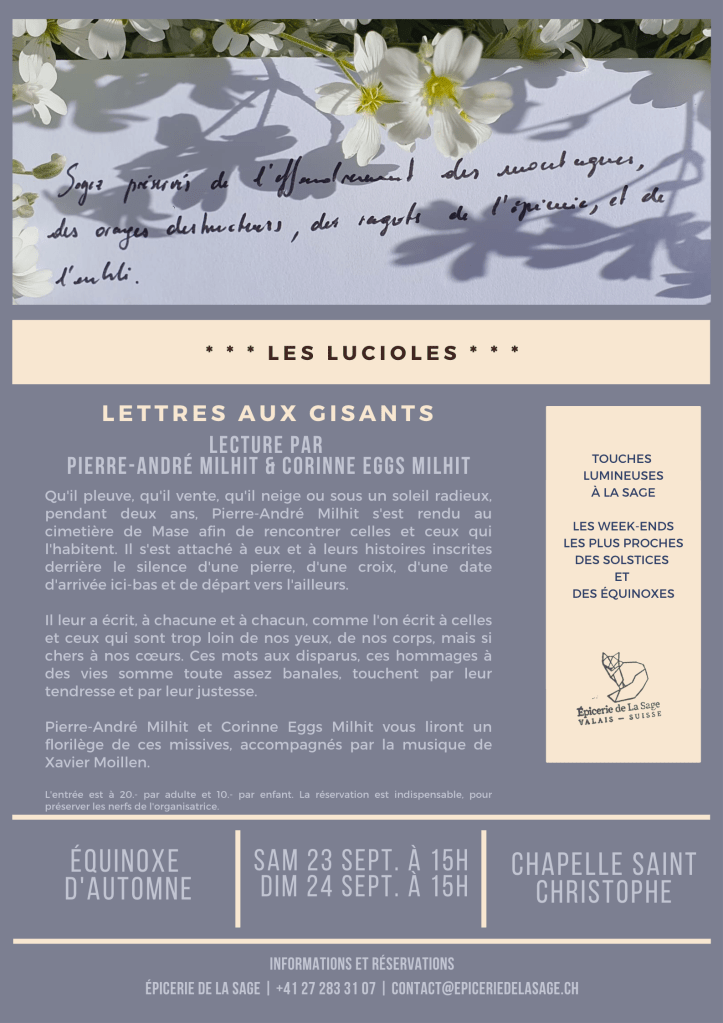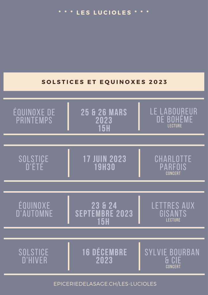 Équinoxe d’automne 2023 Réservez par email à contact@epiceriedelasage.ch, par téléphone au 027 283 31 07 ou en me rendant visite pendant les heures d’ouverture de l’épicerie. Programme complet de 2023