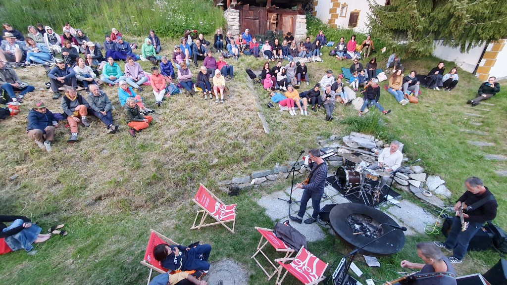 Nous étions presque cent. Cent personnes assises dans un pré, dans le Vieux Village de La Sage. La vue sur le Pigne était sublime, le soleil généreux jusqu’à la dernière minute, rasant les crêtes, comme pour savourer chaque note de guitare électrique et chaque battement de percussion. Les grillons s’en sont donnés à cœur joie également, manifestant la toute puissance de la nature sur la culture. Le moment était suspendu, je l’ai savouré et j’espère que vous aussi. Il me semble bien que oui… Pour celles et ceux qui n’ont pas pu venir, je vous raconterai tout ça avec joie à votre prochain passage à l’épicerie.