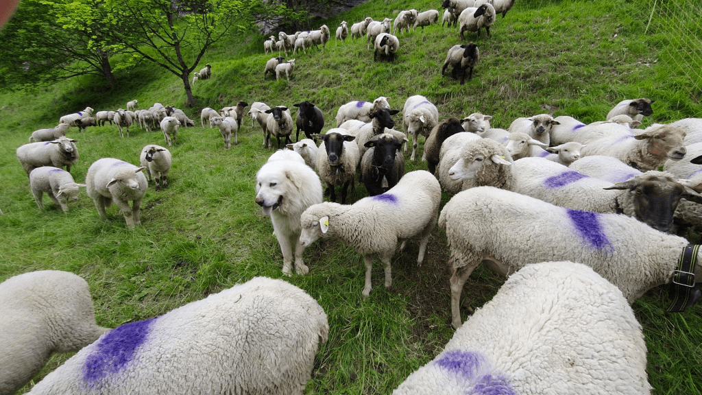 D’ailleurs, les jolies brebis de Marie vous saluent, ainsi que son Patou (oui, regardez bien l’image…). J’en profite pour vous informer que ces charmantes demoiselles s’apprêtent à rejoindre leur alpage, sous la garde attentive de Cyprien, le berger de Chemeuille. Il en résulte donc que les laitières seront bientôt taries et donc les petits brebis frais de Marie, ça finit tout bientôt.