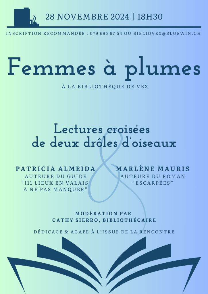 Si vous n’en avez pas encore assez d’entendre parler de mes lectures, ou même, s’il vous venait l’envie d’assister à l’une d’elles, sachez que je serai le mardi 5 novembre au Grand Café de la Grenette à Sion, à 20h. J’ai le plaisir de pouvoir également proposer une lecture croisée avec mon impertinente acolyte Patricia Almeida, le 28 novembre prochain, à la Bibliothèque de Vex. Je vous mets le flyer ci-dessous :