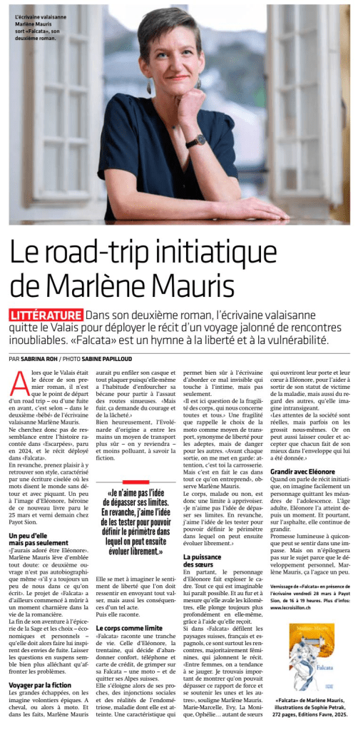 La journaliste du Nouvelliste, Sabrina Roh, annonce la venue de Falcata comme celle d’un deuxième « bébé ». Il se porte bien, la maman aussi. Nous avons tous deux hâte de partir à la rencontre du monde, à l’image d’Eléonore, l’héroïne de ce périple à travers les Alpes.