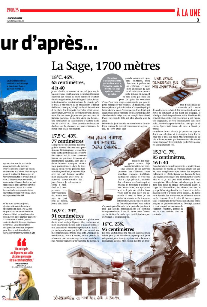 Le 17 avril, nous avons vécu une situation tout à fait particulière et, espérons-le, très extraordinaire. La rédactrice en cheffe adjointe du Nouvelliste m’a contactée pour me demander si j’acceptais de rédiger une petite chronique sur ce jour particulier. J’ai accepté avec plaisir, même si j’ai été un peu surprise par la vision qu’a eu l’illustrateur de moi… mais c’est bien évidemment sa liberté artistique. Je me vois plus joviale et moins portée sur le rouge, mais ma foi, c’est ainsi. Je suis tout de même heureuse d’avoir pu transmettre, entre deux coupures de réseau, un texte sur cette journée hors du temps. Nous n’avons, finalement, pas été coupés du monde… mais c’est le monde qui a été coupé du paradis !