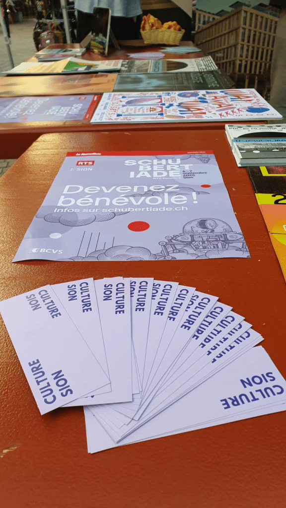 J’ai adoré assister aux concerts de percussions, qui m’ont fait songer que je pourrais être une batteuse dans l’âme. Mener mon petit monde à la baguette, je crois que cela m’aurait plu. Durant l’après-midi, j’ai participé à l’enregistrement du Kiosque à Musique, présenté par Jean-Marc Richard, et ai pris en même temps mon rôle de bénévole très à cœur, puisque je devais également surveiller une porte d’évacuation en cas d’incendie. Je me suis sentie drôlement utile, pour dire vrai. L’événement, pluriel et populaire, m’a remis les pendules à l’heure: la Schubertiade RTS d’Espace2 approche… et il y a tant et tant à faire encore, puisque je suis missionnée comme chargée de projet. Et d’ailleurs, si vous souhaitez assister à ce magnifique événement, tout en vous rendant utile·s vous aussi, sachez que nous recrutons des bénévoles pour les 6 et 7 septembre prochains à Sion.