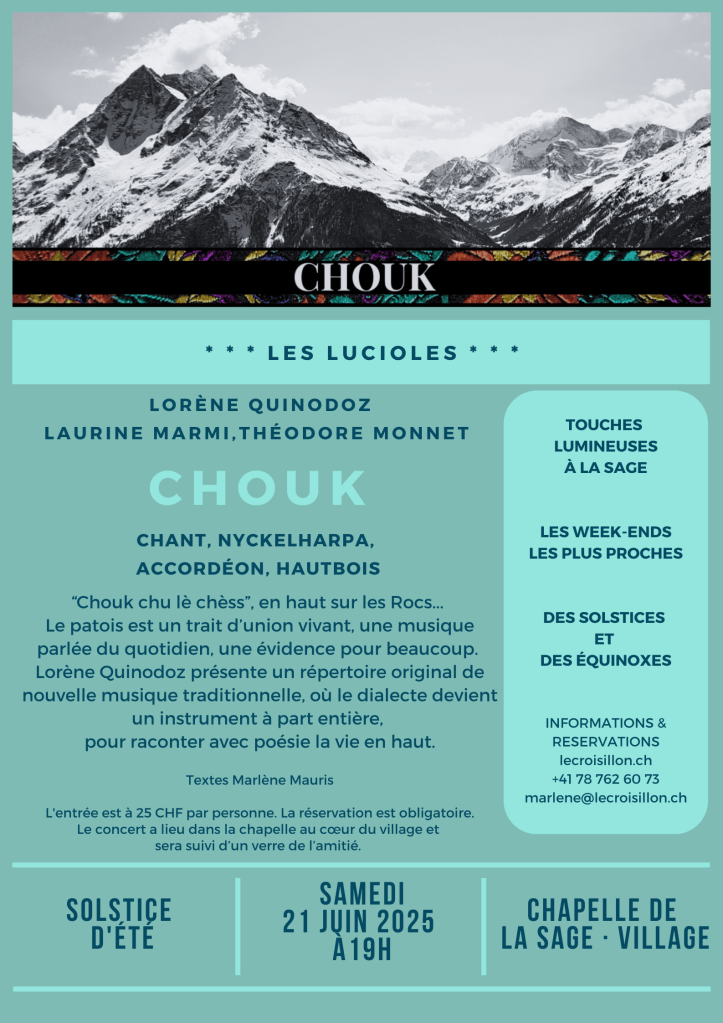 Le samedi 21 juin, L’Impertinente vous donne rendez-vous à La Sage pour le concert du solstice d’été ! Chouk est le projet de la chanteuse Lorène Quinodoz, dont les compositions sont teintées de nombreuses influences, tout en s’orientant vers la nouvelle musique traditionnelle. En allemand, cela semble moins artificiel, puisqu’on parle de manière très détendue de Neue Volksmusik. Elle m’a invitée à écrire des textes dans notre langue de cœur, le patois, pour ce répertoire musical original. Si j’ai déjà eu la chance et l’honneur de collaborer sur de nombreuses créations avec la chanteuse Sylvie Bourban (qui était d’ailleurs hier soir sur Canal9) pour ses albums jazz, aujourd’hui, je mets mon dialecte au service d’un autre style musical, qui m’est encore peu familier, mais dont j’apprends énormément, et ce avec beaucoup de joie !
