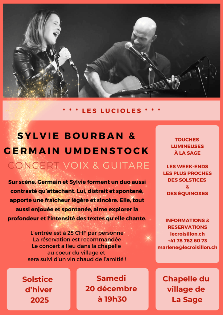 C’est devenu un rituel, un rendez-vous incontournable, et j’en suis ravie, car ce concert du solstice d’hiver marque du sceau de l’amitié la rencontre entre le public de La Sage et la chanteuse Sylvie Bourban, qui nous régale chaque année d’une nouvelle invitation musicale.