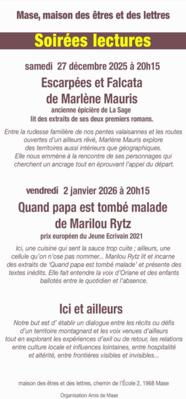 Les Amis de Mase organisent une soirée de lecture et d’échanges de 20h à 22h, autour de mes romans Escarpées et Falcata, sur le thème « Ici et ailleurs ».