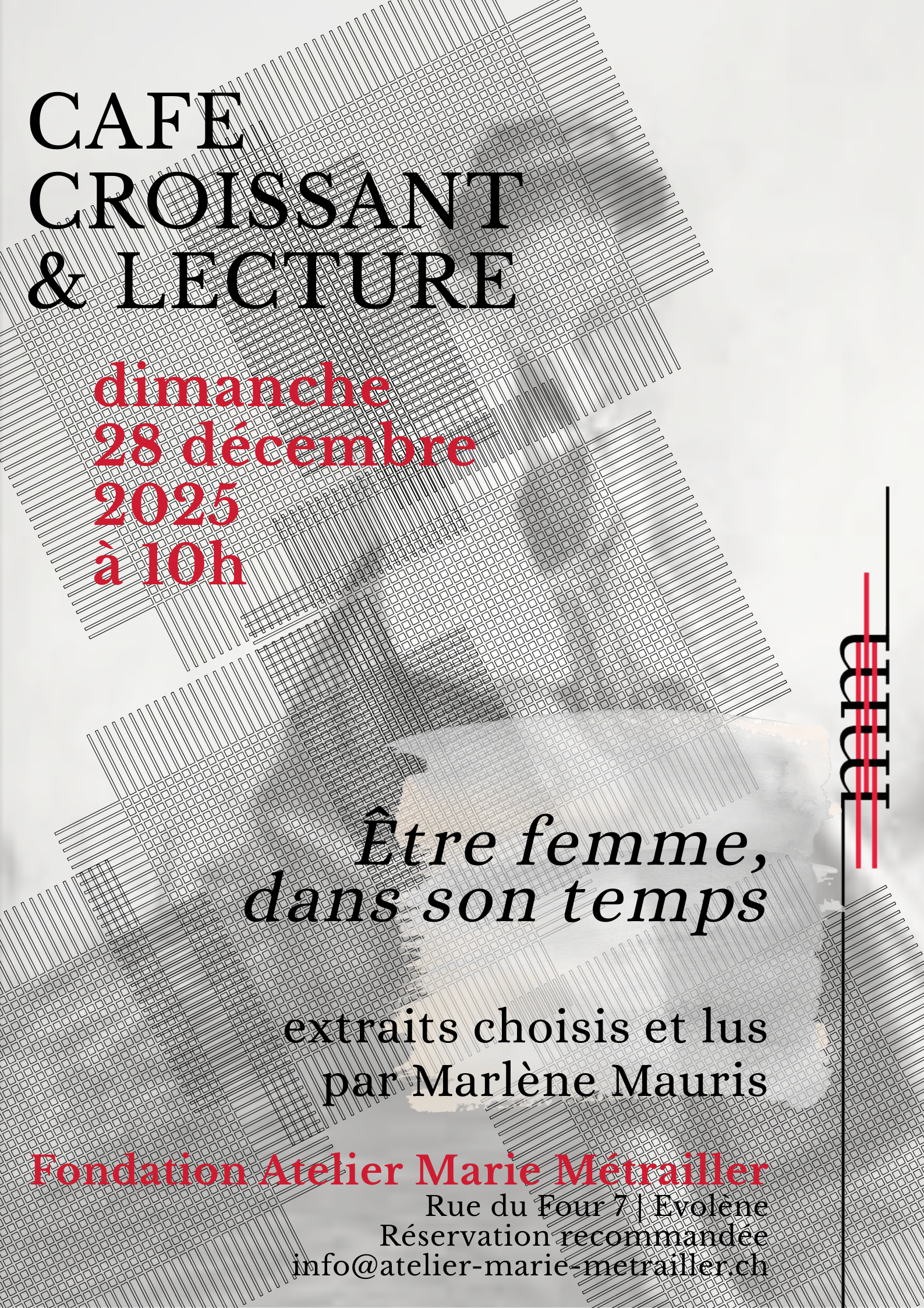 La Fondation Atelier Marie Métrailler nous convie à un café – croissant & lectur à 10h, à l’atelier de tissage. Des extraits croisés de la Poudre de Sourire et de Falcata seront accompagnés d’un bon café croissant. « Être femme, dans son temps ».
